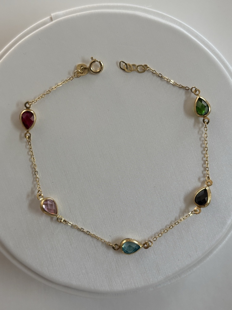 צמיד ה-Lara Rainbow Drops עשוי זהב צהוב 14K איכותי ומעוצב בסטייל עדין ומלא חן. לאורך שרשרת הזהב משובצות חמש אבנים מרהיבות בחיתוך טיפה (Pear Cut) בצבעים שונים – אדום עז, ורוד רומנטי, כחול שמיים, ירוק עמוק ושחור קלאסי. השילוב בין הגוונים התוססים לזהב המבריק יוצר מראה ורסטילי ומרגש שמתאים לכל לוק ולכל מצב רוח.