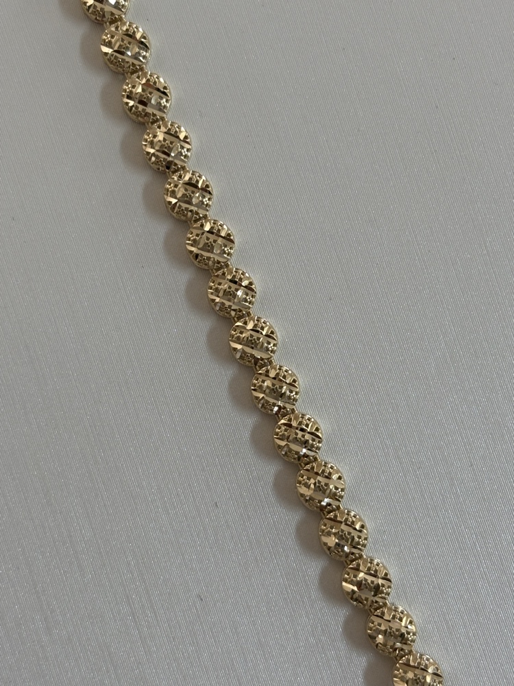 צמיד ה-Lara Shimmering Discs עשוי זהב צהוב 14K איכותי ומציג עיצוב מתוחכם של חוליות עגולות ושטוחות המשולבות זו בזו. הייחודיות של הצמיד טמונה בטקסטורת חיתוכי הלייזר (Diamond Cut) המורכבת על גבי כל חוליה, היוצרת אפקט של נצנוץ עוצמתי המדמה שיבוץ אבנים יוקרתי, ללא צורך באבנים כלל.