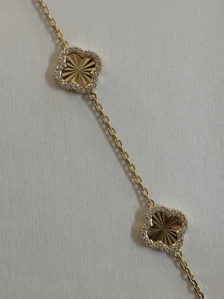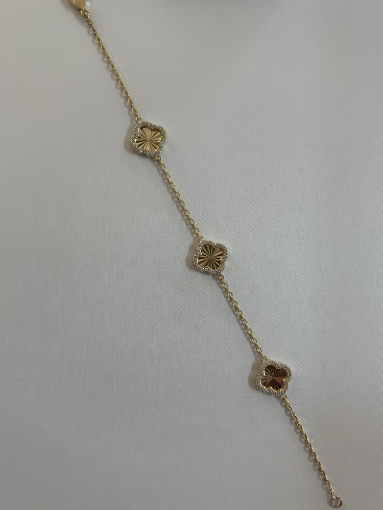 צמיד זהב צהוב 14K עם 3 תלתני "מזל" משובצים במסגרת אבנים | דגם "Lara Halo Clover"