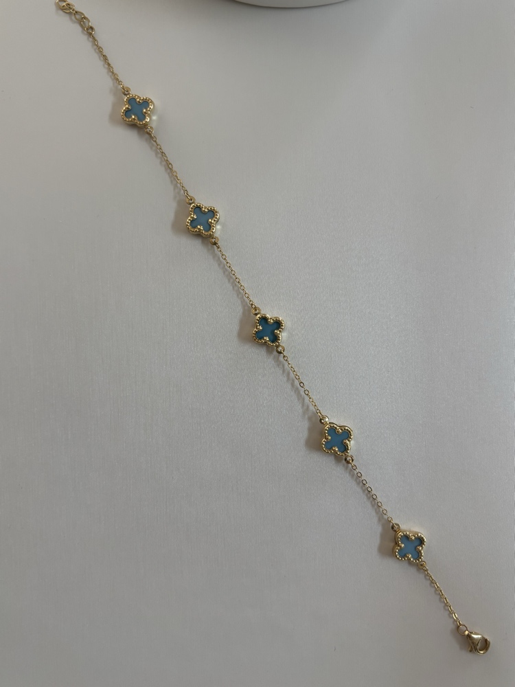 צמיד ה-Lara Azure Clover עשוי זהב צהוב 14K איכותי ומציג את אחד העיצובים המבוקשים והאהובים ביותר בעולם התכשיטים. לאורך השרשרת העדינה משובצים חמישה אלמנטים מרהיבים בצורת תלתן (Clover), המעוטרים במסגרת זהב מגורענת (Beaded edge) ומשובצים באבנים בגוון כחול טורקיז עמוק ומהפנט. השילוב בין הזהב המבריק לכחול העז יוצר מראה אלגנטי, יוקרתי ומלא נוכחות.